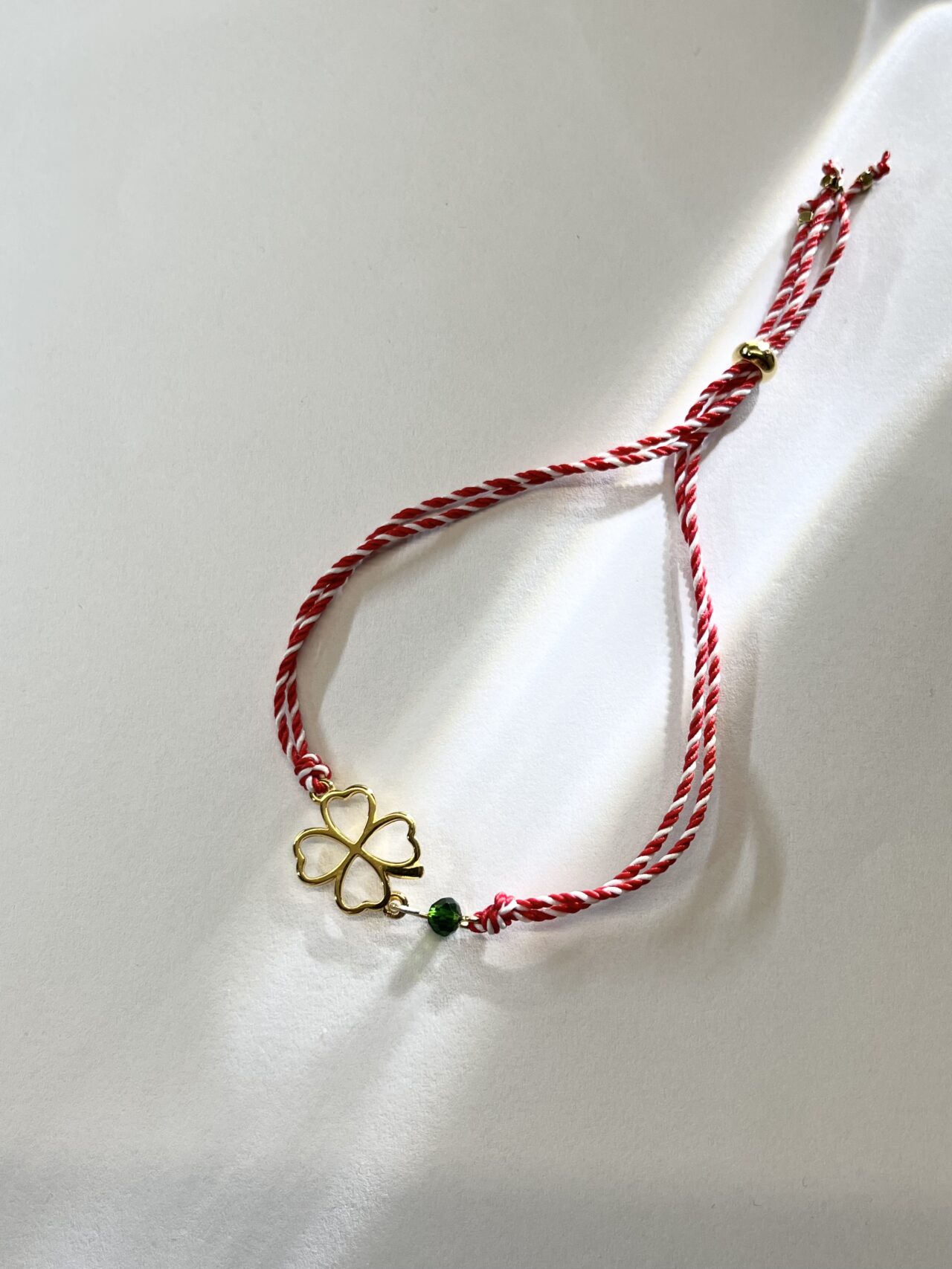 Χειροποίητο βραχιόλι Μαρτάκι με κόκκινο και άσπρο κορδόνι, σύμβολο τύχης, προστασίας και ανανέωσης. Είναι διακοσμημένο με ένα τετράφυλλο τριφύλλι και πράσινη χάντρα, που του προσδίδουν μια μοντέρνα και ταυτόχρονα παραδοσιακή αισθητική.